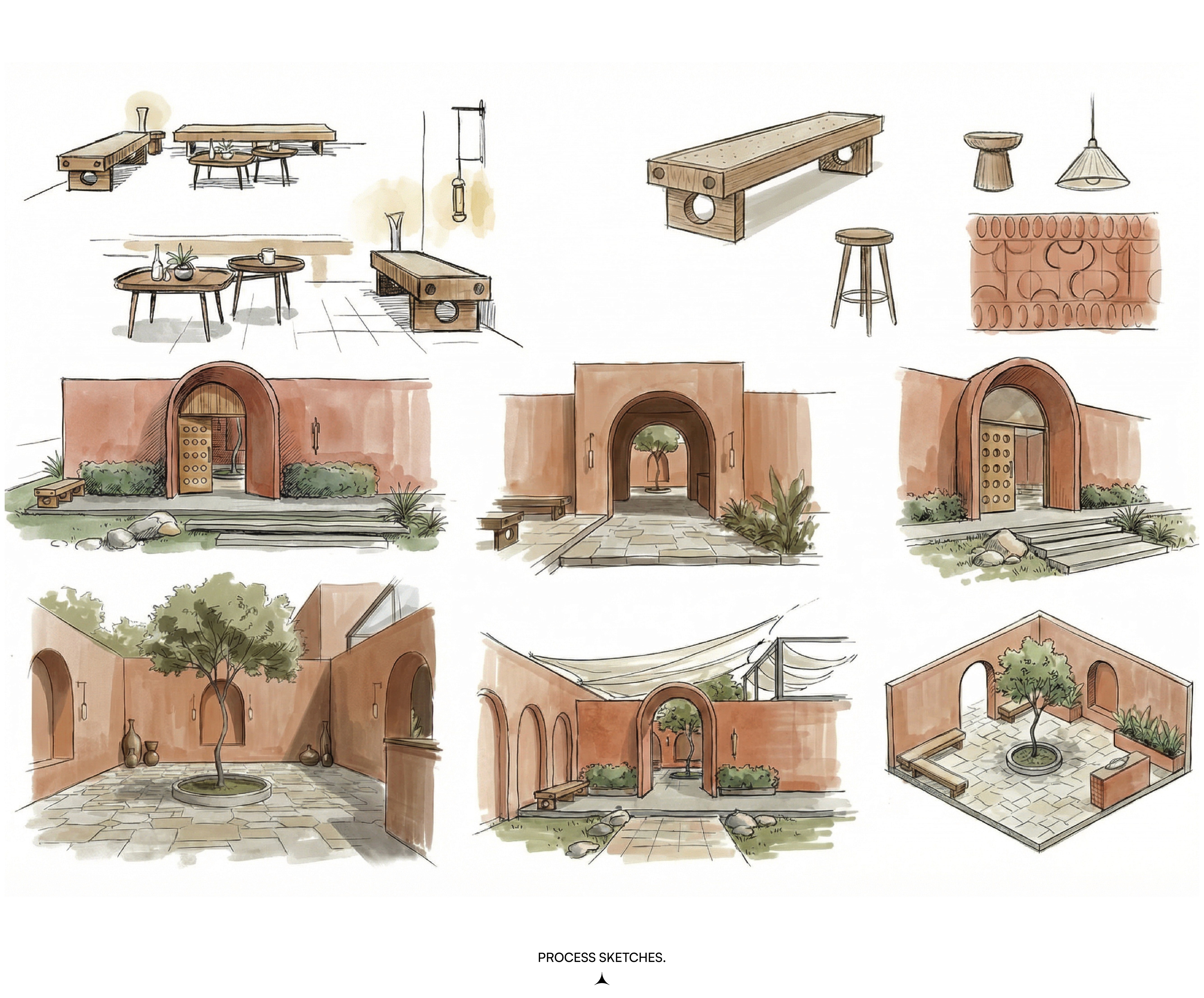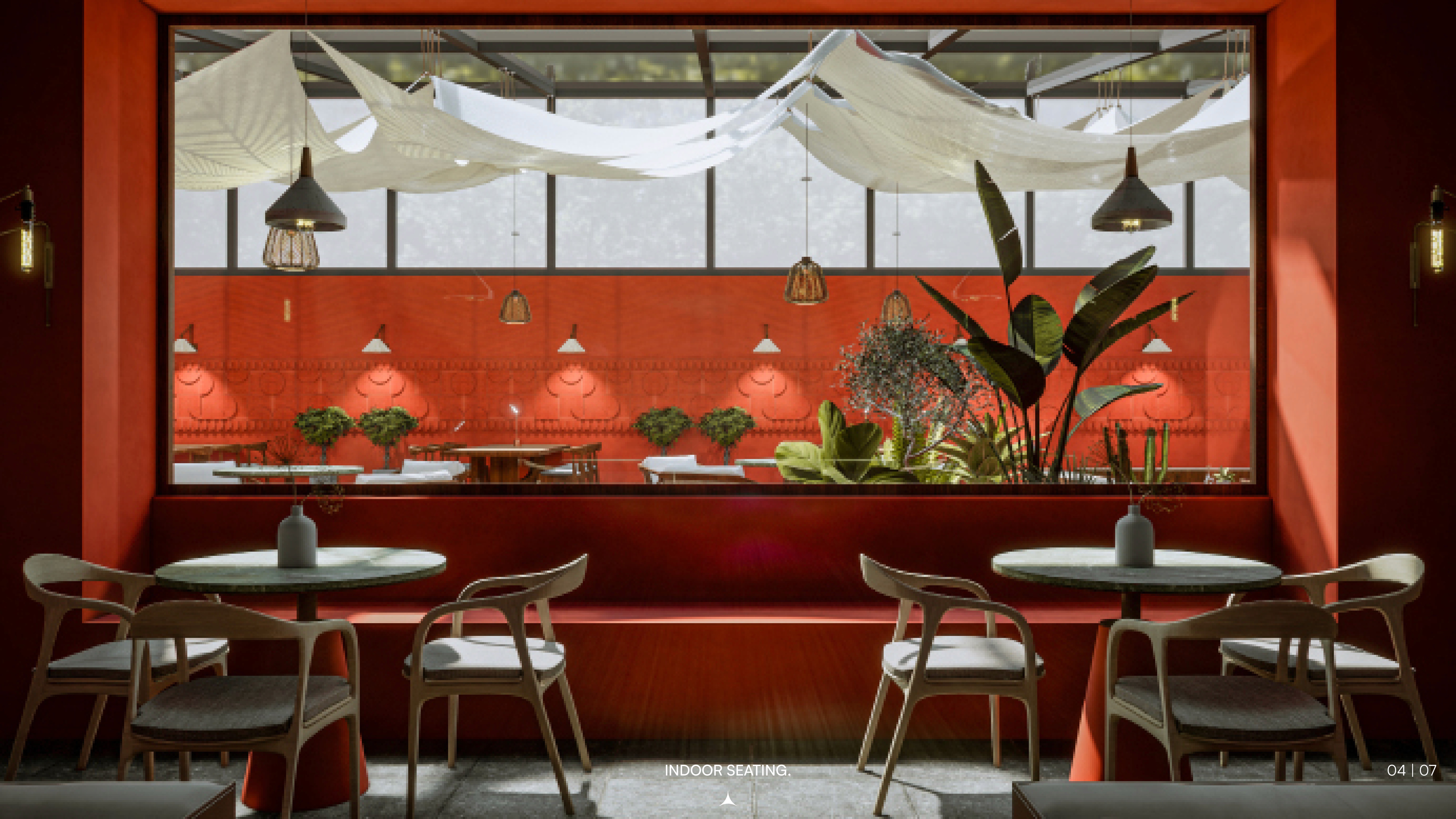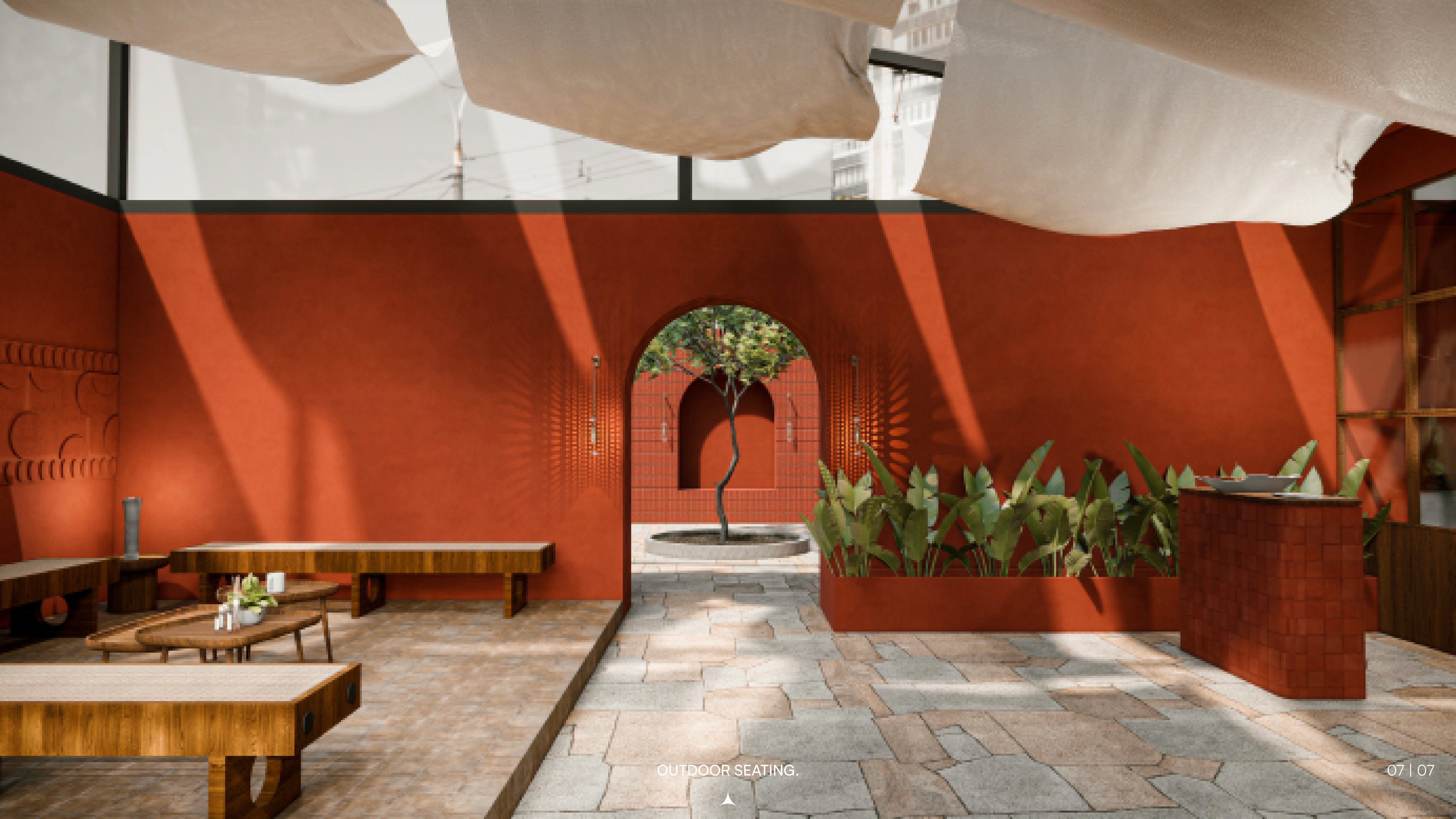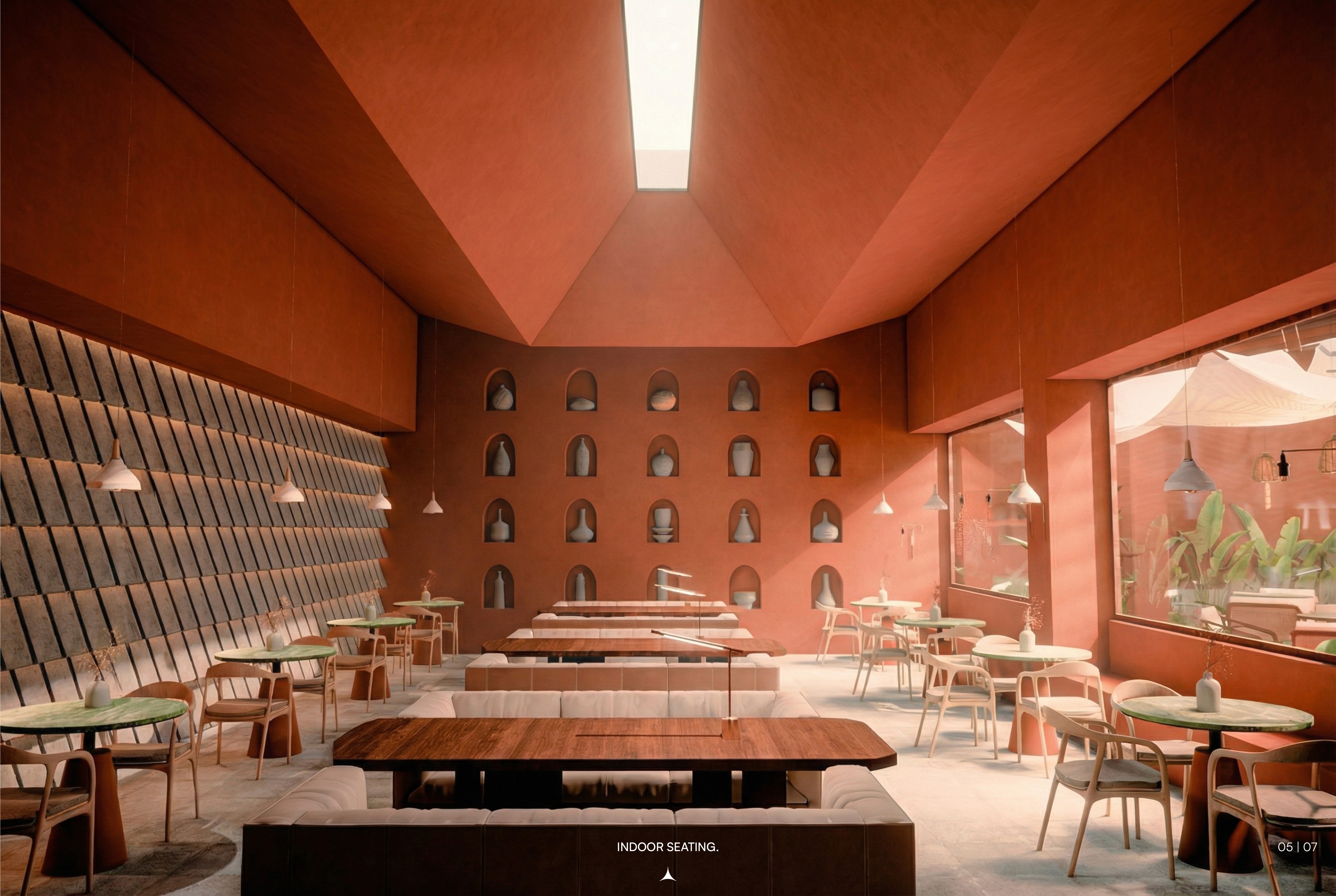 The design employs terracotta as both structure and story: walls, floors, and custom elements create material continuity between indoor and outdoor zones. A fabric canopy and glass roof shelter the outdoor area, maintaining openness while protecting from elements. Inside, a monumental skylight becomes the spatial anchor, casting shifting light patterns that animate terracotta surfaces throughout the day. The earthy material palette (terracotta, natural wood, greenery) grounds the experience while the skylight introduces verticality and drama. Arched openings reference traditional terracotta architecture, creating rhythmic transitions between dining zones. The result is a restaurant functioning as culinary sanctuary—where material, light, and landscape merge into cohesive experience.